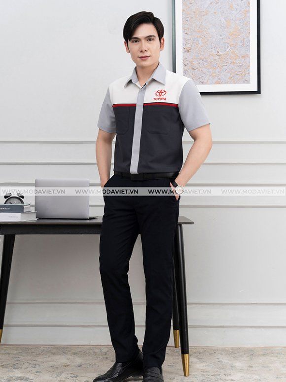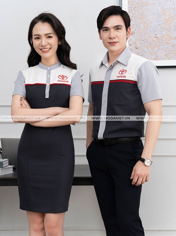 Áo đồng phục Toyota được ModaViet thiết kế đơn giản với dáng suông khoẻ khoắn kết hợp cùng tay áo ngắn năng động. Sử dụng gam màu trung tính, sang trọng là màu ghi đậm – nhạt và trắng để làm nổi bật lên logo Toyota màu đỏ được thêu tỉ mỉ bên ngực trái, giúp thu hút và tạo được ấn tượng tốt nơi người nhìn. Tổng thể tạo nên một chiếc áo đồng phục năng động, trẻ trung nhưng không kém phần lịch sự, phù hợp với hình ảnh của đội ngũ tư vấn viên chuyên nghiệp, nhiệt tình